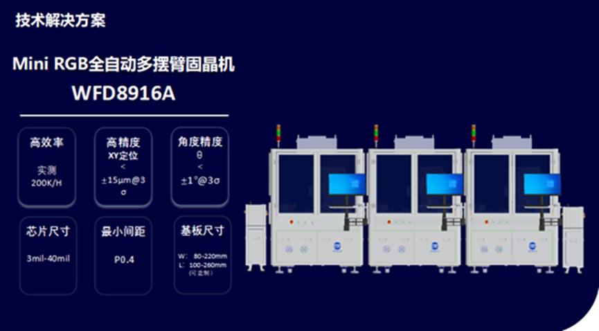 截至目前,針對直顯和背光市場需求,萬福達已推出WFD8960B、WFD8970A、WFD8970B、WFD8916A等多款固晶機,其中WFD8970B單機產(chǎn)能實測高達75K/H,RGB三臺串聯(lián)即WFD8916A產(chǎn)能實測200K/H,在業(yè)內處于領先水平。與此同時,萬福達還推出Mini LED全自動生產(chǎn)線相關設備及解決方案。